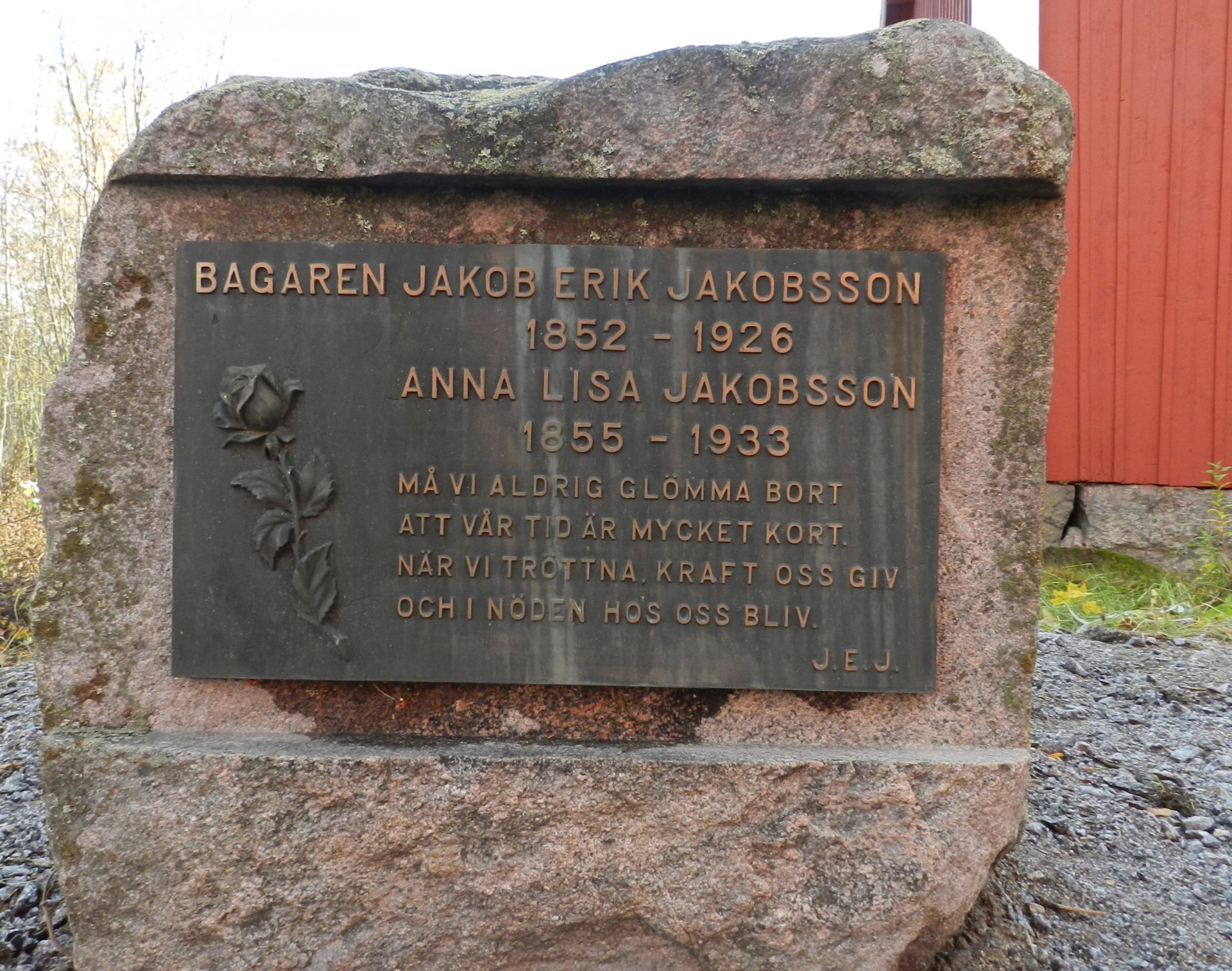 Sockenbagaren Jakob Erik Jakobsson föddes 1852-04-24 i Petsmo på Lund hemman. Han avled 1926-10-19 i Kvevlax. Jakob var bagare nästan hela sitt yrkesverksamma liv och den ende bagaren Kvevlax sockens. Sitt näringstillstånd fick han av Guvernörsämbetet 1876 som 24-åring. Bagerirörelsen var ett familjeföretag också i den bemärkelsen att alla deltog i arbetet, även barnen vartefter de blev tillräckligt stora. På programmet fanns fem standardprodukter: ankarstockar, örfilar, grisar, kanelskorpor och de vittberömda pepparkakorna, en specialitet till julen var "morogubbarna". En helt annan produkt som man tidvis förfärdigade, var åkerbärssylt. Vissa år bredde man 100l ”vilkonsylt”! Produkten såldes burkvis till herrskapsfolk i staden. Trots att Jakob aldrig fått möjligheten att gå i skola var han en flitig läsare och en skicklig pennans man. Han var också en flitig diktförfattare. Jakob Erik skrev ca 150 dikter varav en del på finska. Finskan hade han lärt sig under sin uppväxttid och gesälltid i Lillkyro, Härma och Laihela.