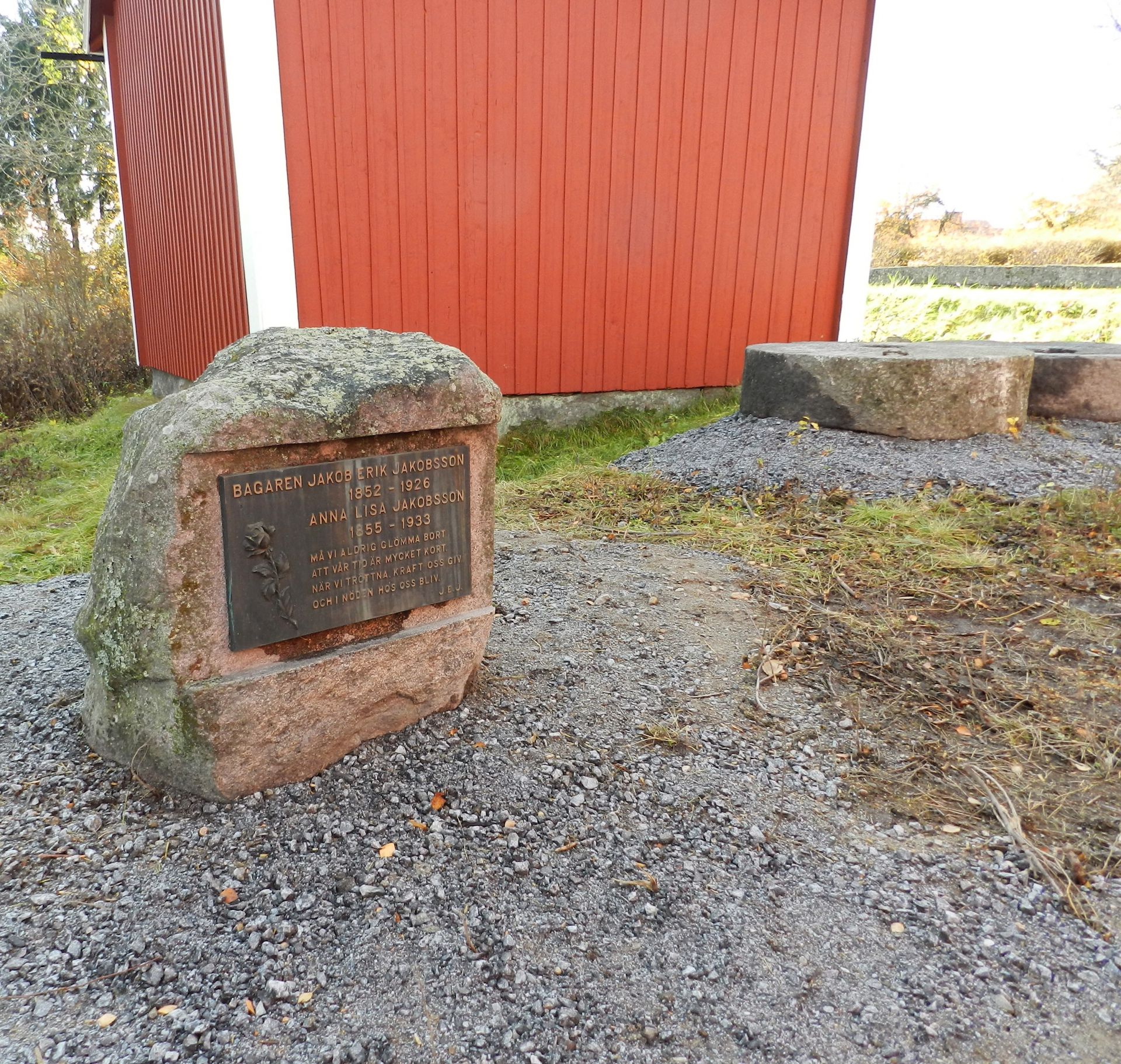 Minnesstenen i sin nya omgivning mellan Sockenmagsinet och prästboden. Prästboden syns i bakgrunden, till höger de stora kvarnstenarna som flyttats från vägkanten till en mera skyddad plats.