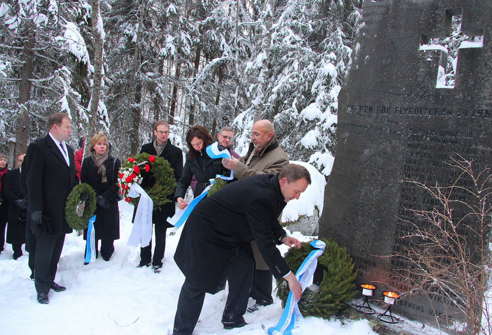 Representanter från staden Jakobstad, församlingarna i Kvevlax, Korsholms kommun samt Finnair lägger ner kransar vid minnesmärket.
