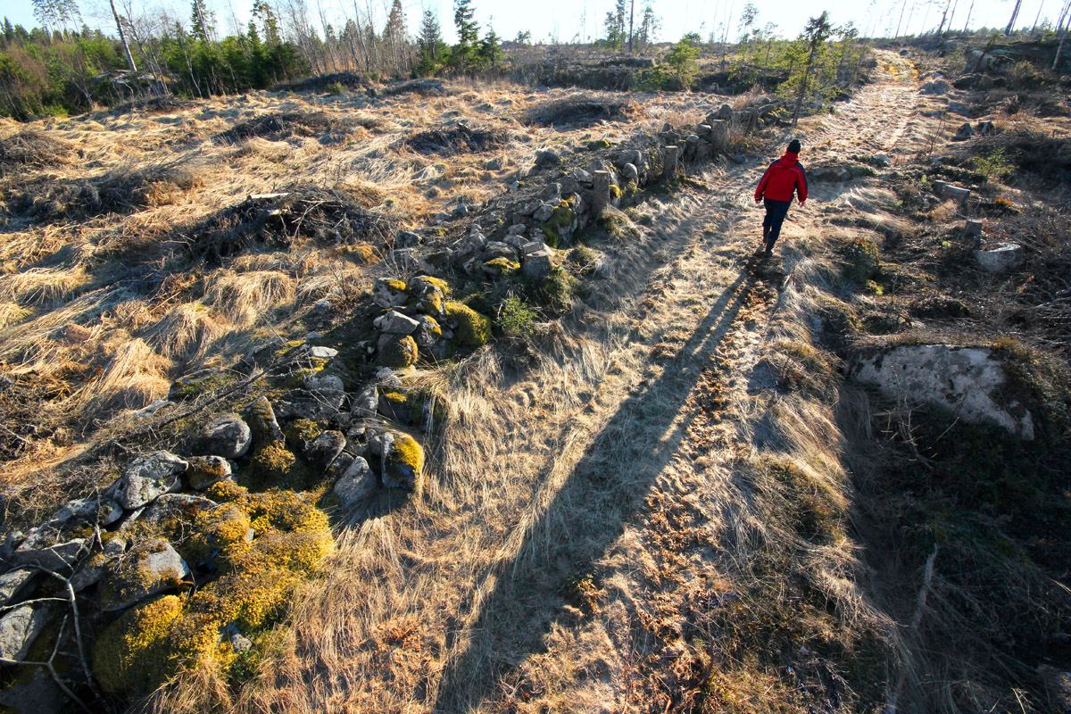 Ett synligt avsnitt av kyrkvägen 2011 vid kalhygget över Källbacken-Fulmossbacken. Till vänster en stenröjd åker.