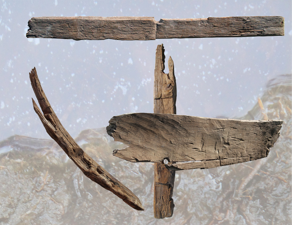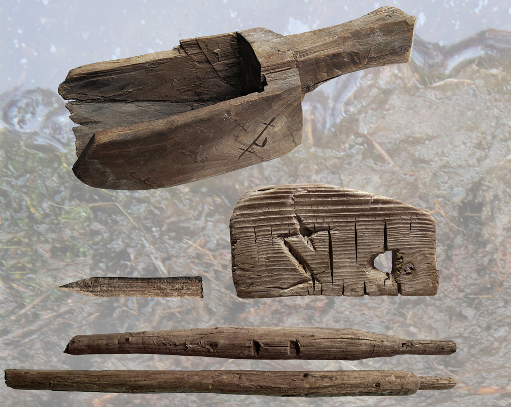 Föremål från Hamnmossens båtfynd: öskar, flöte, vässad pinne och fragmentariska åror. Museiverkets C14-datering av båtens bottenplanka gav till resultat att båten är från 1400-1500-talet.