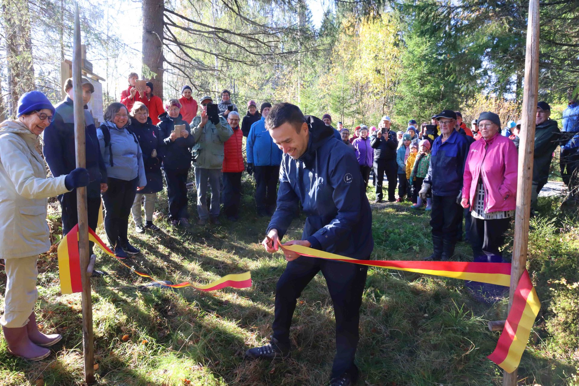 Hembygdsföreningen såg denna söndag som ett naturligt tillfälle att officiellt inviga vandringsleden, som nu försetts med kart-, text- och bildförsedda informationstavlor samt vägvisare längsmed leden. Efter avslutad gudstjänst samlades deltagarna vid det uppspända gulröda sidenbandet för att ta del av invigningsceremonin. Hembygdsföreningens ordförande Ulla-Maj Salin berättade i korthet om arbete kring Kyrkvägen och de nyss uppsatta informationstavlorna, som lokala företagare och organisationer sponsorerat. Med en gammaldags ull-/fårsax klippte kyrkoherde Kass bandet och till applåder förklarades Kyrkvägen invigd och öppnad.