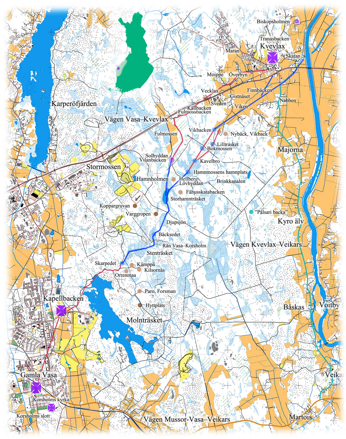 Den gamla kyrkvägsrutten genom väglöst land från Kvevlax till Gamla Vasa (Mussor-Mustasaari) är inritad på grundkartan. Rött markerar landbaserade avsnitt och blått vattenavsnitt. Vägens längd var ca 10 km till den äldsta kyrkan på Kapellbacken och ca 12,5 km till ruinerna av Sankta Maria kyrkan i nuvarande Gamla Vasa. Sankta Maria kyrka byggdes i slutet av 1400-talet eller i början av 1500-talet. Innan fanns det en äldre träkyrka på samma plats, troligen var den från 1300-talet. Vägen via Veikars är markerad med grönt i början och från Veikars med orange.