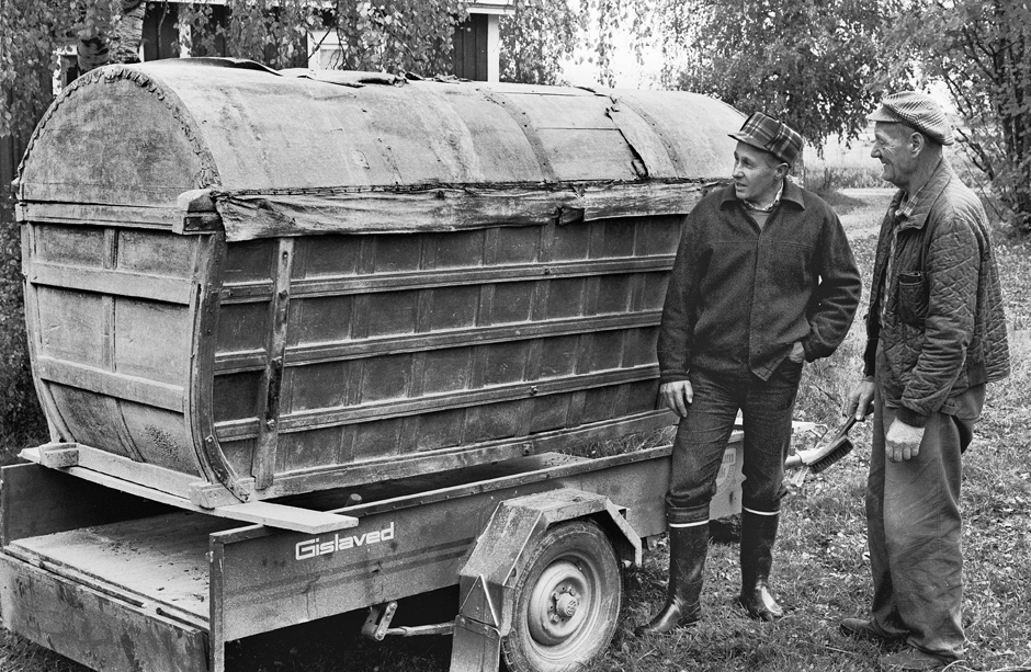 Alf Svahn och Levi Almén med vagnskorgen (från 1808-09 års krig) som Levi hittade på vinden vid Golkas kvarn i Lillkyro på 1980-talet. Korgen, som köptes av mjölnaren Bertel Snickars, hade under lång tid använts som spannmålslår vid mottagandet av kvarntull.