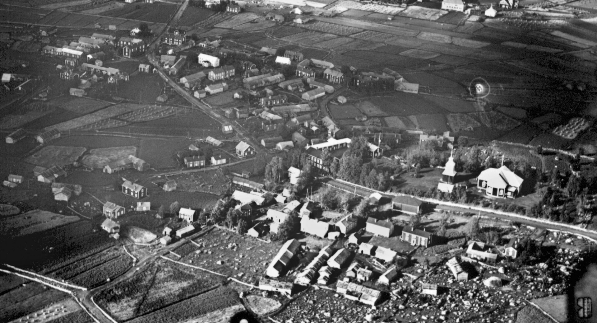 Kyrkan till höger som den tiden var rödmålad, andra sidan vägen finns bl.a. sockenmagasinet samt Väktas och Nyysto gårdarna. Längst till vänster Herrgårds- och Öurasbacken.